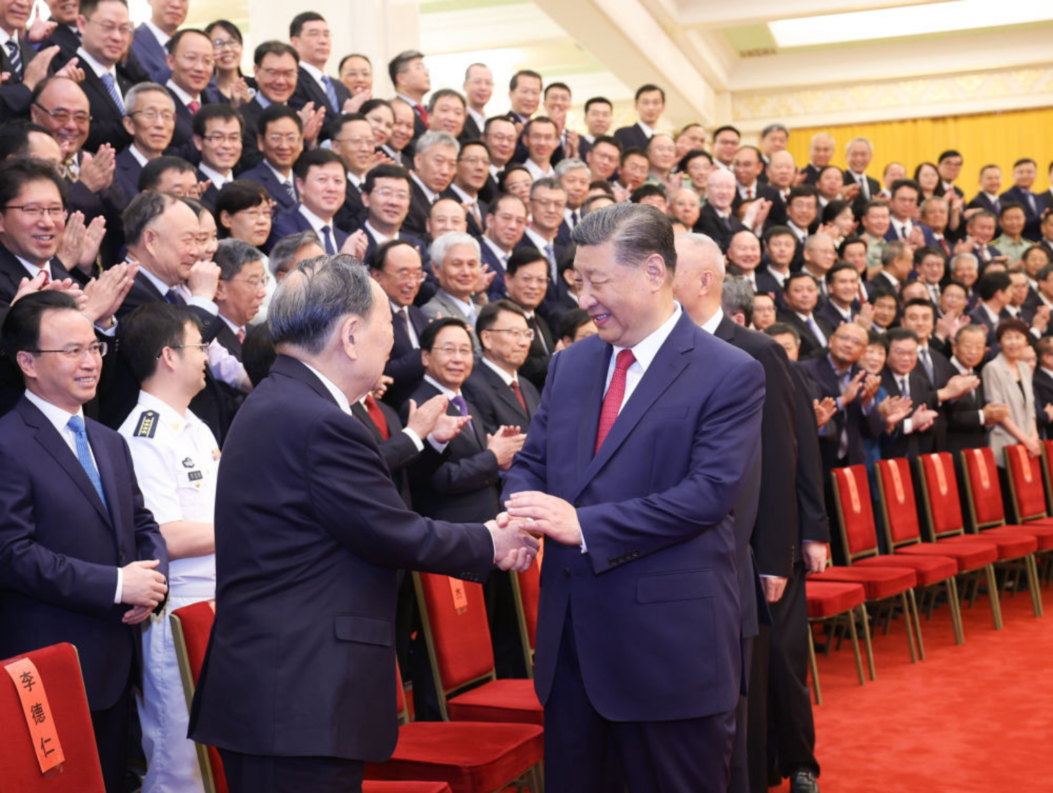 6月24日,全国科技大会、国家科学技术奖励大会和中国科学院第二十一次院士大会、中国工程院第十七次院士大会在北京人民大会堂隆重召开。中共中央总书记、国家主席、中央军委主席习近平向获得2023年度国家最高科学技术奖的武汉大学李德仁院士(右)和清华大学薛其坤院士(左)颁奖。新华社记者 鞠鹏 摄
