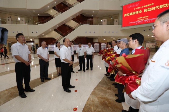 2023年8月19日,自治区副主席廖品琥,自治区卫生健康委党组书记、主任杜振宗,自治区卫生健康委党组成员,自治区中医药局党组书记、局长黎甲文一行到广西国际壮医医院看望慰问奋战在一线的医师代表,向他们表示诚挚的问候。